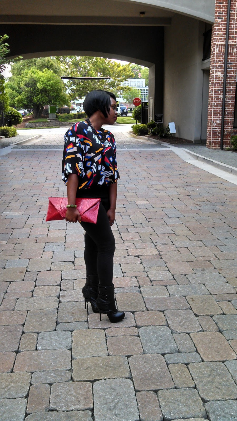 I really love the bold print shirt. It makes such a statement. I love how you paired the red clutch with it to bring out the red in the shirt. Great look!
